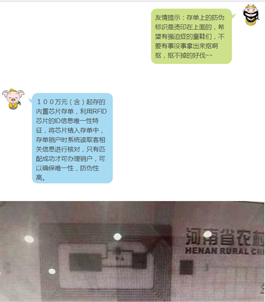 近日,河南農(nóng)信號稱“氣死騙紙”的新大額存單全面啟用,新大額存單主要加入了防偽全息標加燙印技術(shù)和RFID防偽芯片技術(shù),在防偽造方面具有先進的技術(shù)水平,具有防偽能力強、科技含量高和可靠性好三大特點,能夠有效了保障客戶資金安全。